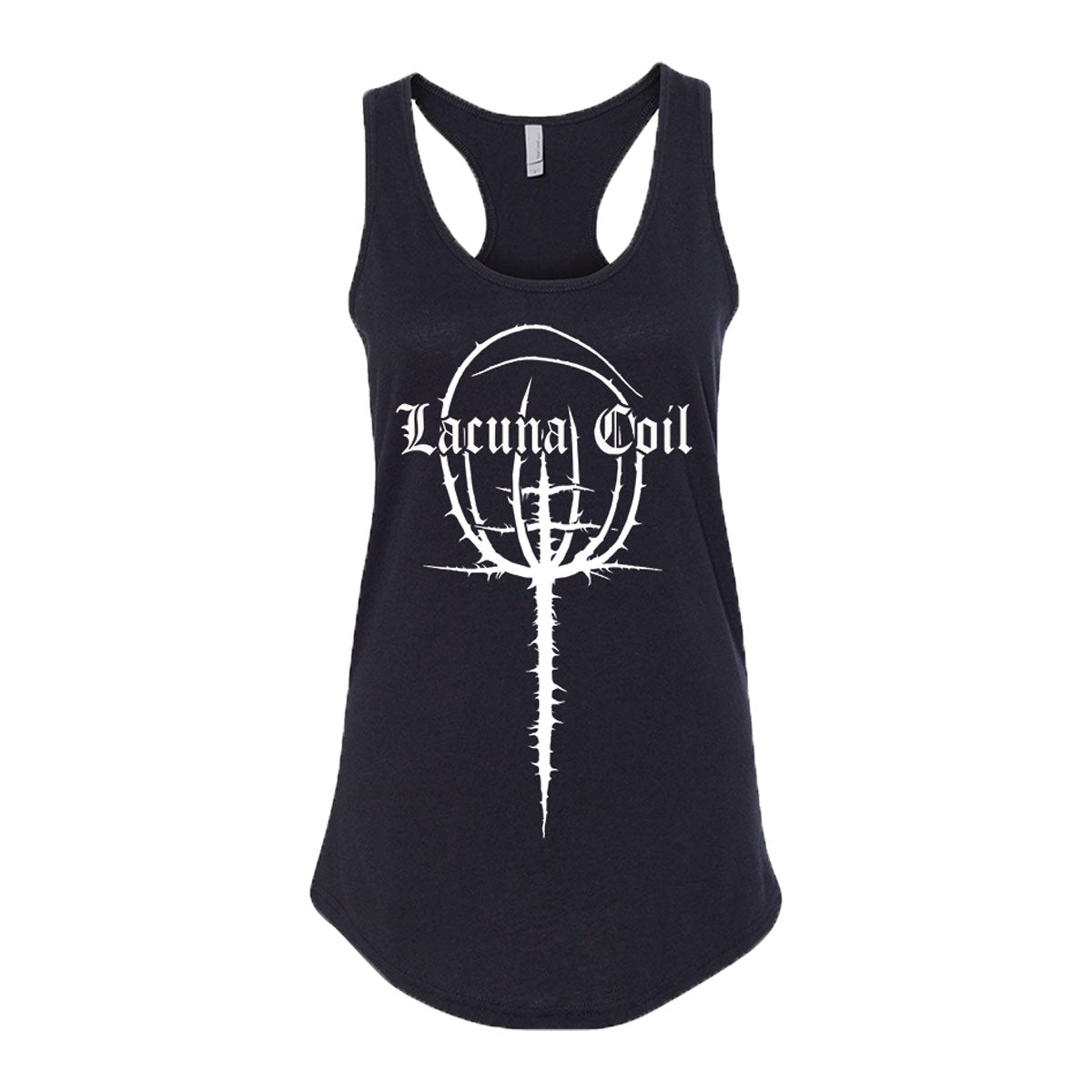 Ladies Tank Top in black featuring Lacuna Coil “Comalies” artwork printed on the front.