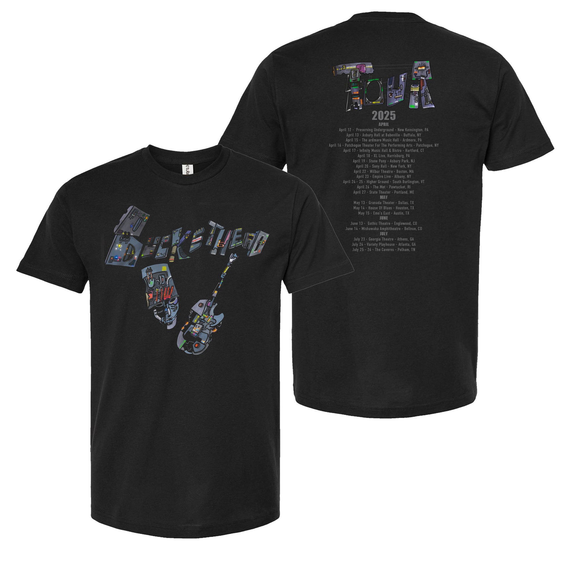 Unisex black t-shirt featuring Buckethead "Cyborb Tour" artwork printed on the front and back.