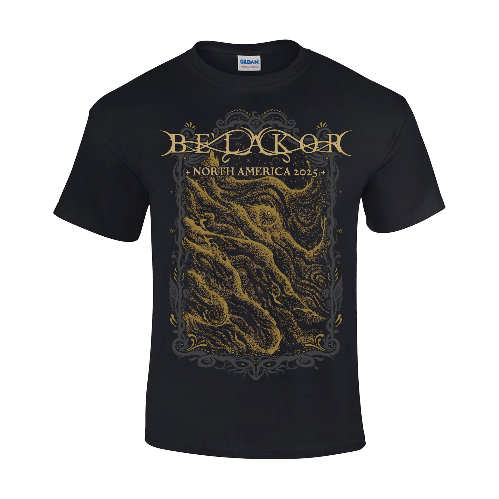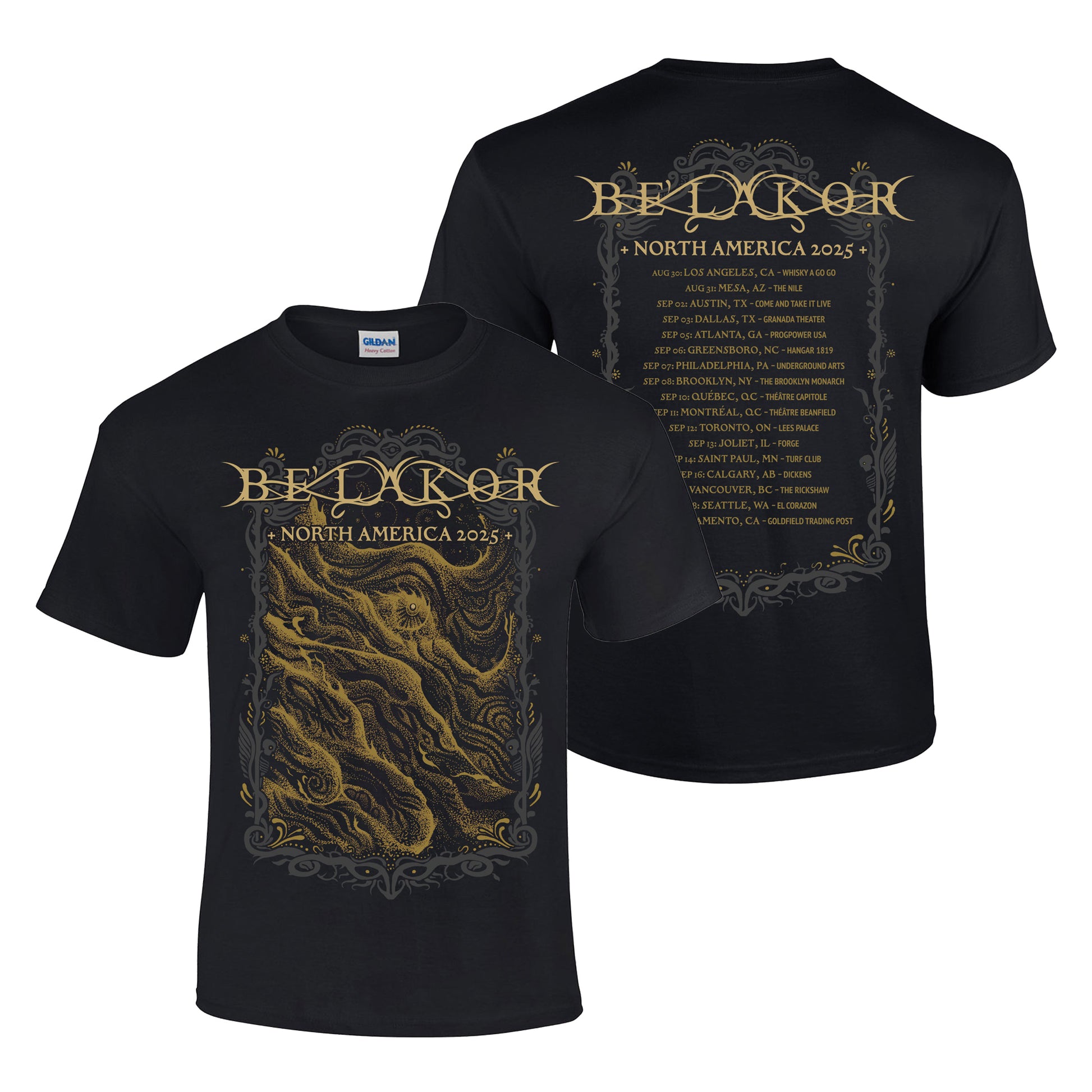Unisex T-shirt in Black featuring Be'lakor "North America 2025 Tour Dates" artwork printed on the front.